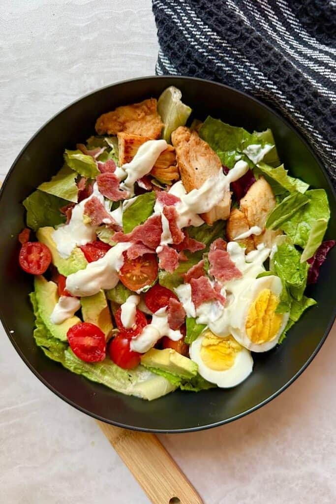 It’s a salad version of the classic BLT sandwich — bacon, lettuce, tomato — with added chicken (and here, avocado) to make it a protein-packed meal.