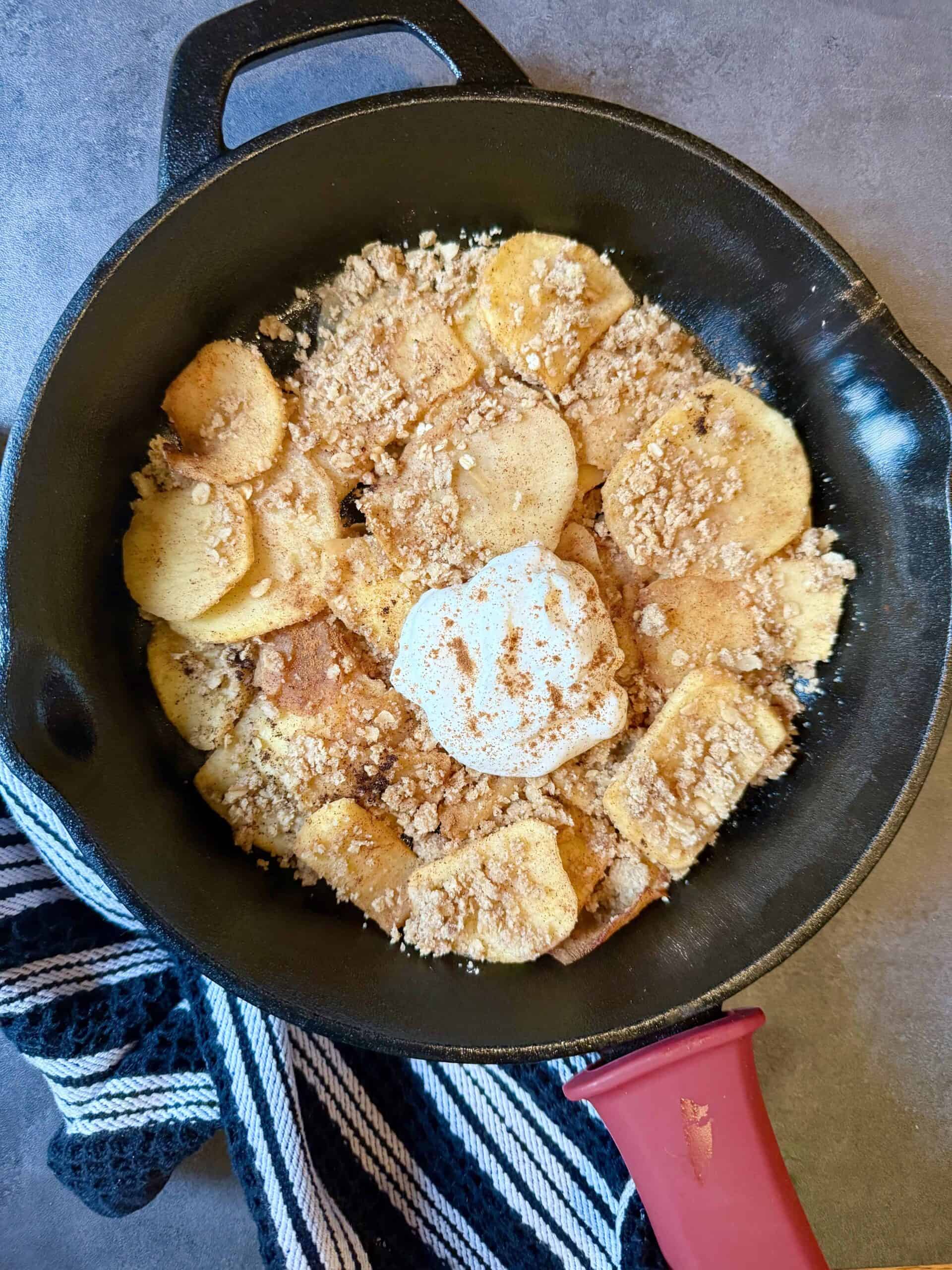 6. Sprinkle the crisp topping evenly over the apples in the skillet.