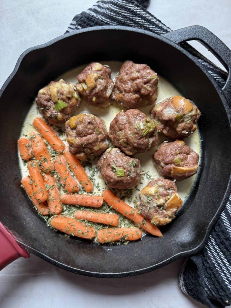 These tender turkey meatballs combine stuffing herbs, sautéed celery and onion, and keto bread crumbs for that true holiday flavor — finished with a creamy, low-carb gravy thickened naturally with cheese