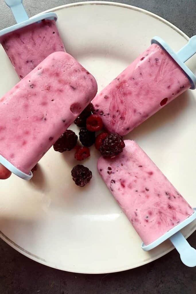 These yogurt popsicles are safe for little ones too — just skip the artificial sweetener and use mashed berries for natural sweetness.